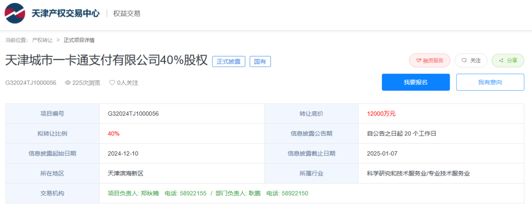日前,天津产权交易中心显示,持牌支付公司天津城市一卡通支付有限公司40%股权挂牌转让,转让底价为1.2亿元,转让方为天津泰达集团有限公司,信息披露截止日期为2025年1月7日。该公司由天津泰达集团有限公司持股40%,天津信城信息系统有限公司持股36.67%,天津安居集团有限公司持股6.67%,天津市公共交通集团(控股)有限公司持股5.33%,天津轨道交通线网管理有限公司持股4.67%,天津市自来水集团有限公司持股3.33%,天津市燃气集团有限公司持股3.33%。据公开信息介绍,天津城市一卡通支付有限公司隶属天津泰达集团。成立于2005年7月,注册资金1.5亿元,承担着天津城市一卡通系统的建设和运营,是天津市唯一拥有市政公用服务领域跨行业IC卡消费业务特许经营权的企业。于2011年获得由中国人民银行颁发的《支付业务许可证》,获准在天津市开展预付卡发行和受理业务。2024年8月1日换证后,业务类型变更为“储值账户运营Ⅱ类”,牌照有效期至2026年12月21日。作为天津市唯一拥有市政公用服务领域跨行业IC卡消费业务特许经营权的企业,承担着天津市城市一卡通系统的建设和运营,在公交、轨道交通、停车、自来水、燃气及商业消费等广泛场景,为持卡用户、合作单位以及签约商户提供消费数据的清算清分和支付结算服务。其旗下的城市卡自2006年开始正式发行,是一张具有电子钱包功能的IC卡,可反复充值使用,目前持卡人可在天津地区公交、地铁、轻轨等市政公用领域应用;城通卡则是一种多用途预付费卡,专门针对企业发行,可在签约商家刷卡消费,涵盖了天津全市范围的众多消费品类和上万家门店。
