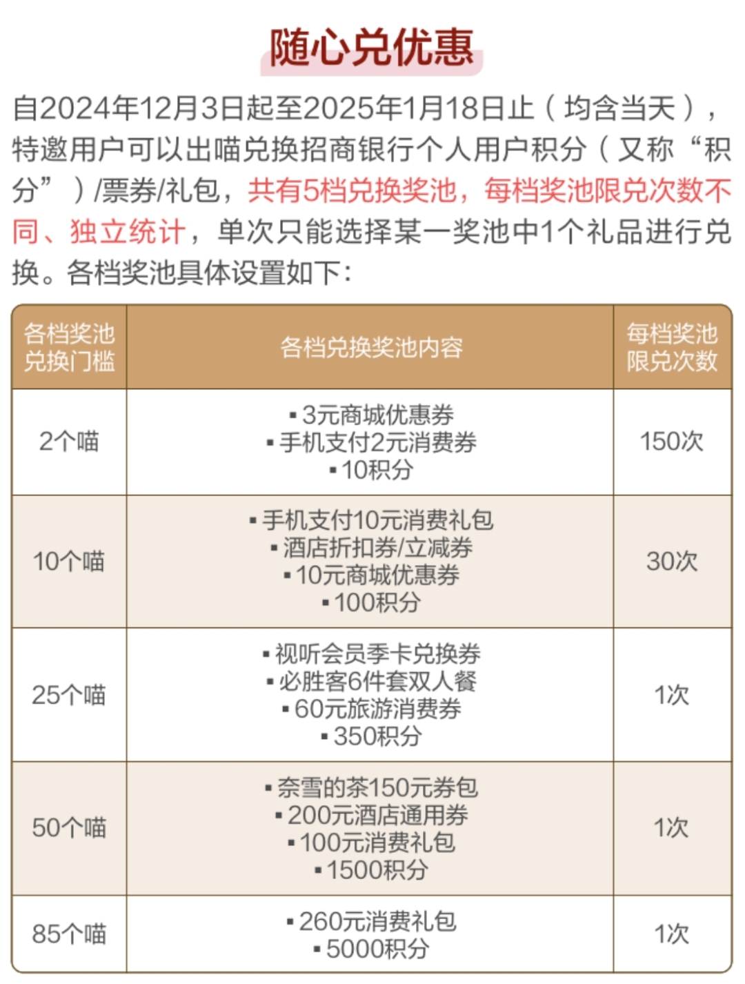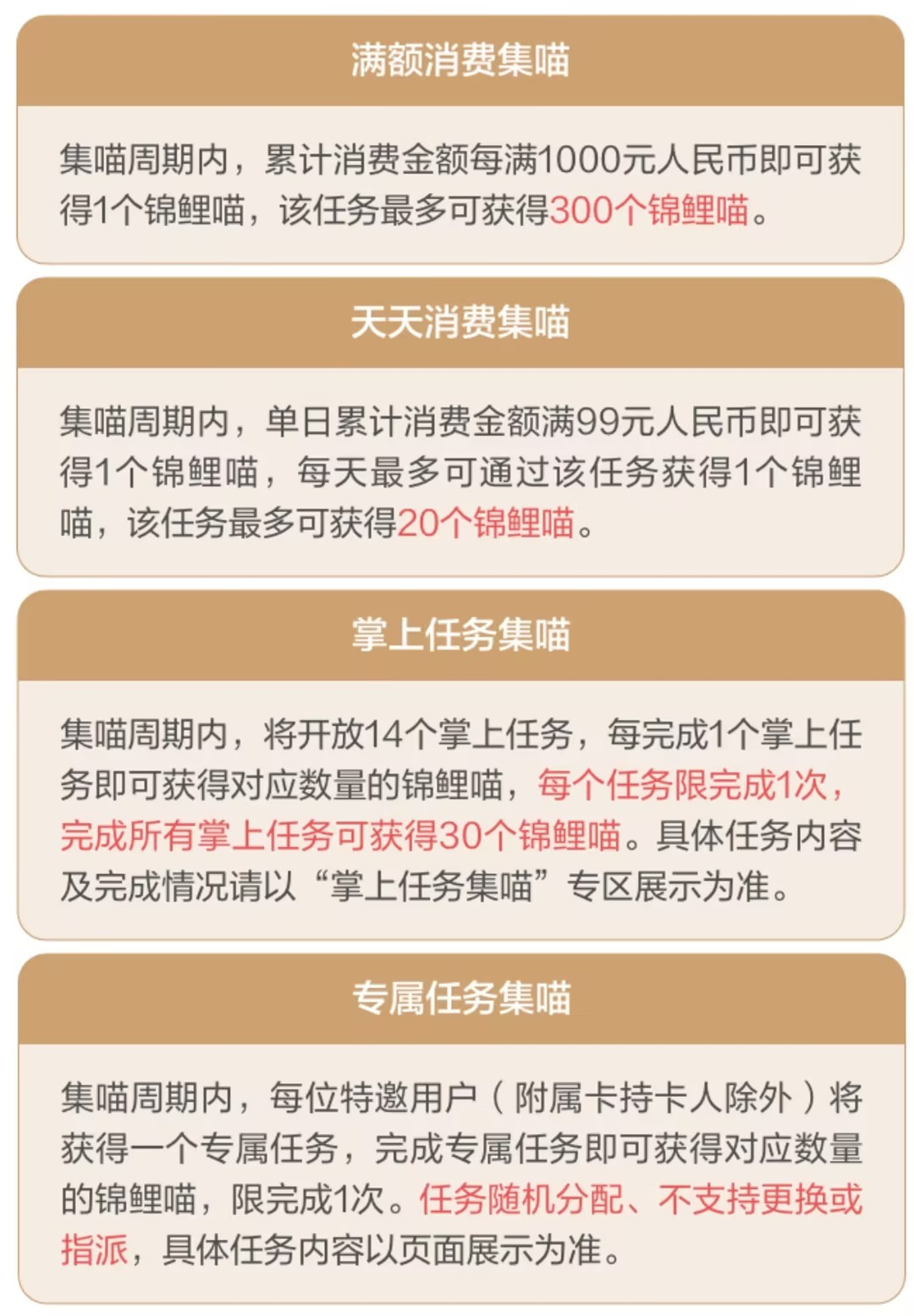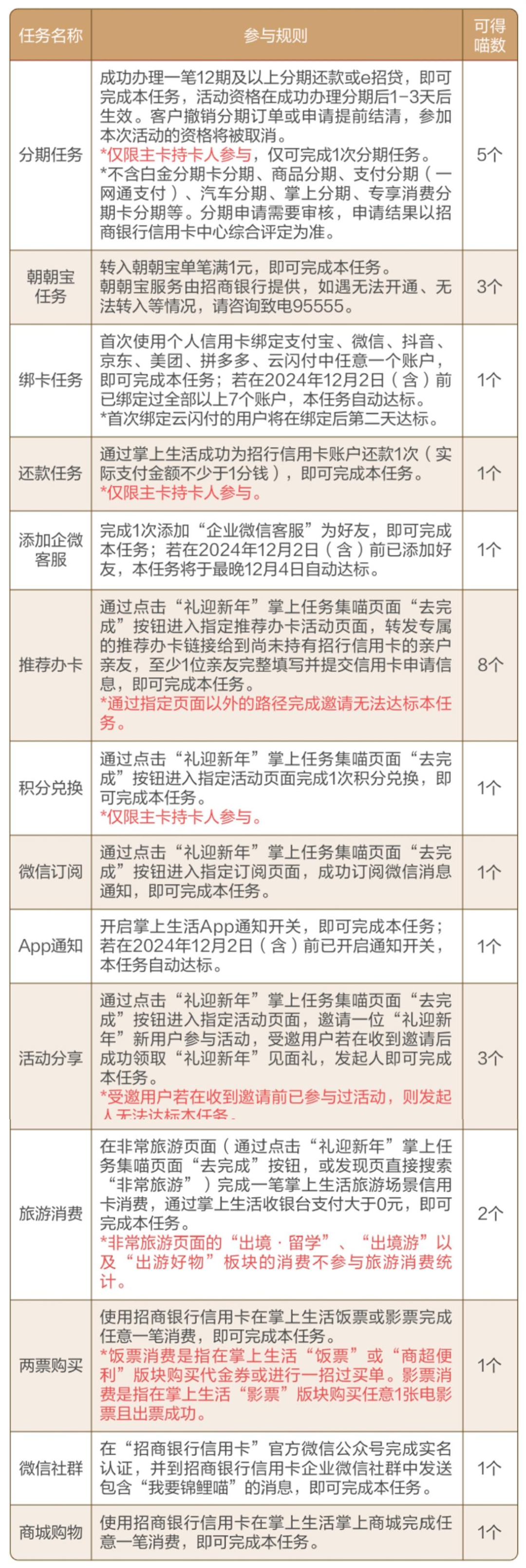 又到12月底了,招行的年末活动今年在月初就早早开始,今年招行的活动内容还是以“集喵”为核心,然后通过“喵”来参与抢拍或者直接兑换心仪的礼品,喵的最终数量决定收益。该活动门槛不高,直接用锦鲤喵(筹码)即可参与,且任务流程也很简单,参与者基本都能拿到礼品,相对来说比较亲民。