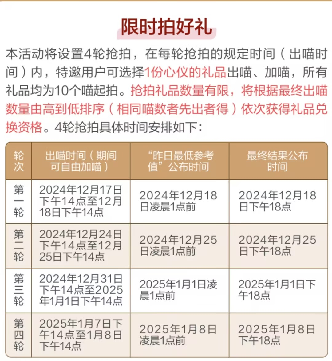整体周期:2024年12月3日 ~ 2025年01月18日。请注意集喵活动将于2025年01月09日结束!