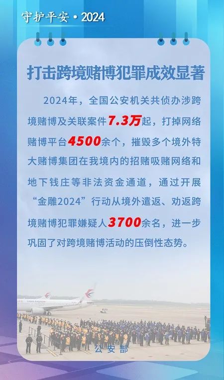 一年来,公安部部署各地公安机关准确把握跨境赌博违法犯罪新形势新动向,坚持以打开路、重拳出击,强化网上网下一体、境内境外联动,摧毁了一大批特大跨境赌博团伙,抓获了一大批不法分子,铲除了一大批黑灰产业链条,有力形成“追着打、精准打、持续打”的高压态势。依托“夏季行动”等专项工作,全国公安机关针对45起重大跨境赌博案件开展4波次集群战役,抓获违法犯罪嫌疑人11000余名。重庆公安机关经过3年的缜密侦查和案件侦办,彻底摧毁了长期盘踞菲律宾向我境内招赌吸赌的“DC”赌博集团。中国警方不断深化国际执法合作,持续推进与有关国家联合执法行动,最大限度挤压涉我跨境赌博犯罪空间。2024年4月和11月,中柬警方先后两次开展包机押解遣返联合行动,湖北、山西公安机关分批将1200余名中国籍涉赌诈违法犯罪嫌疑人从柬埔寨押解回国。各地通过开展“金雕2024”行动,从境外遣返、劝返跨境赌博犯罪嫌疑人3700余名,包含一批头目、金主和骨干,沉重打击了境外涉我犯罪集团的嚣张气焰。工作中,公安机关会同网信、外交、文旅、人民银行、商务、移民管理等部门,强化协同配合,多管齐下、多策并举,深入开展涉赌支付机构、直播式网赌、非法彩票、涉赌投资和劳务专项治理,深入推进跨境赌博旅游目的地“黑名单”等制度,强化涉赌资金链、技术链等全链条治理措施,取得积极成效。同时,各地各部门强化宣传教育,通过多种方式载体深入揭批赌博“十赌十骗、十赌十输”的害人本质,及时跟进曝光跨境赌博犯罪最新手段,有力提升了全民识赌拒赌反赌的意识和能力。