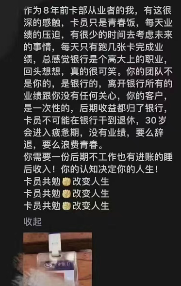 作为8年前卡部从业者的我,有着很深的感触,卡员只是青春饭,每天业绩的压迫,有很少的时间去考虑未来的事情,每天只有跑几张卡完成业绩,总感觉银行是个高大上的职业,回头想想,真的很可笑。