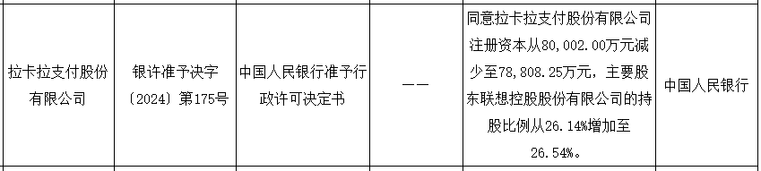 据人民银行银许准予决字〔2024〕第175号显示,同意拉卡拉支付股份有限公司的注册资本从80002万元减少至78808.25万元,主要股东联想控股股份有限公司的持股比例从26.14%增长至26.54%。事实上,拉卡拉本次减资,背后与部分限制性股票的回购注销有所关联。
