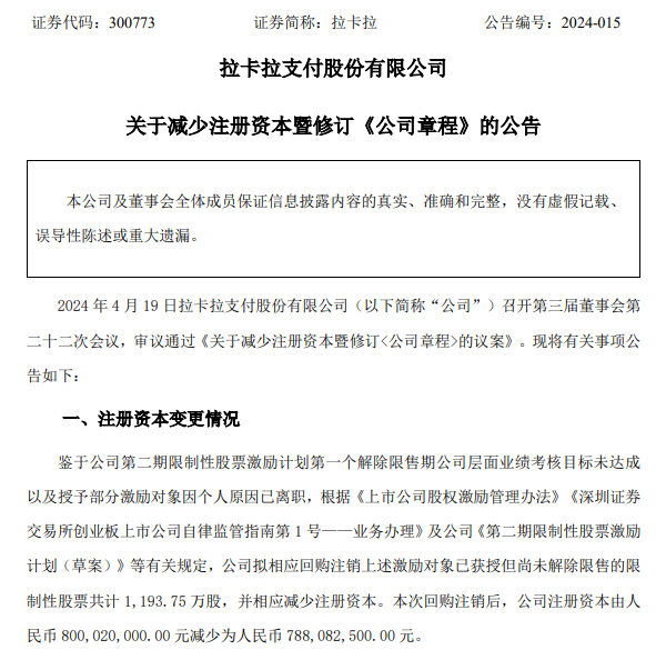 拉卡拉曾在4月发布“关于减少注册资本暨修订公司章程的公告”,指出鉴于公司第二期限制性股票激励计划第一个解除限售期公司层面业绩考核目标未达成以及授予部分激励对象因个人原因已离职,公司拟相应回购注销激励对象已获授但尚未解除限售的限制性股票共计1193.75万股。本次回购注销后,公司注册资本由人民币80002万元减少为人民币78808.25万元。简单来讲,限制性股票激励计划,即上市公司以低于市场价格授予激励对象一定数量的本公司股票,激励对象只有在满足特定的工作年限或业绩目标后,才能解除这些限制。而通过回购注销限制性股票,公司可以减少流通在外的股份,进而优化资本结构;同时这一操作会带来上市公司股本总额的减少,相应减少了注册资本。对于该动作对公司的影响,拉卡拉在公告中强调,“不会影响公司的持续经营能力,不会对公司的财务状况和经营业绩产生重大影响,也不会影响公司核心员工的积极性和稳定性”。拉卡拉2024年三季度财务报表显示,今年前九个月,拉卡拉实现营业收入4,391,904,307.33元,同比微降0.8%;归属母公司股东净利润512,842,837.72 元,同比下降17.49%。