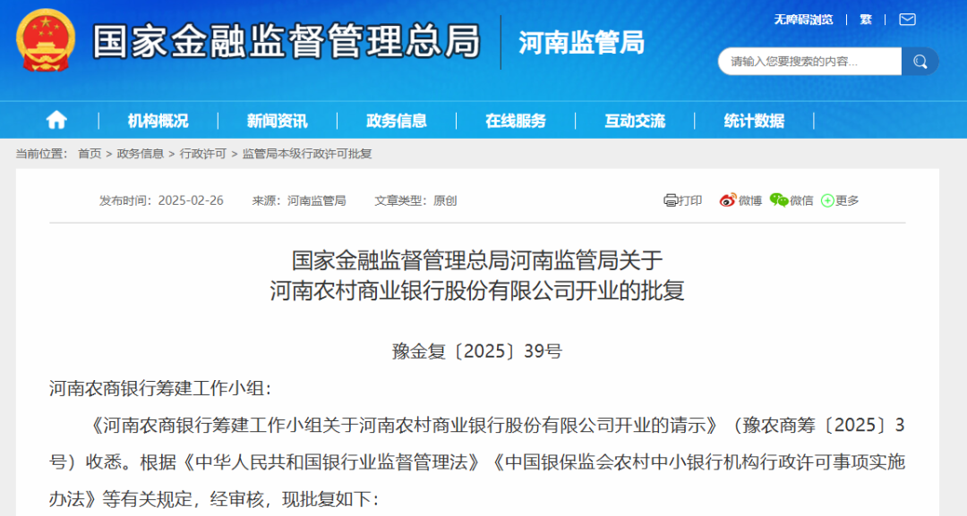 2月26日,国家金融监督管理总局官网发布《国家金融监督管理总局河南监管局关于河南农村商业银行股份有限公司开业的批复》(简称“批复”),同意河南农村商业银行开业,同意河南农村商业银行郑州中心支行等891个分支机构开业,并接受金融监管总局派出机构的属地监管。